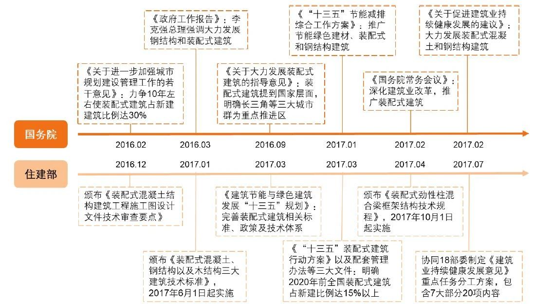 在“环保趋严+劳动力紧缺”背景下,中央层面持续出台相关政策,大力推广装配式建筑。自2013年国家发改委、住房和城乡建设部发布《绿色建筑行动方案》开始,国家就密集制定关于推广装配式建筑的政策文件,在发展规划、标准体系、工程质量、产业链管理等多方面有明确要求。2016年2月,国务院颁发《关于进一步加强城市规划建设管理工作的若干意见》,力争用10年左右时间,使装配式建筑占新建建筑的比例达30%。